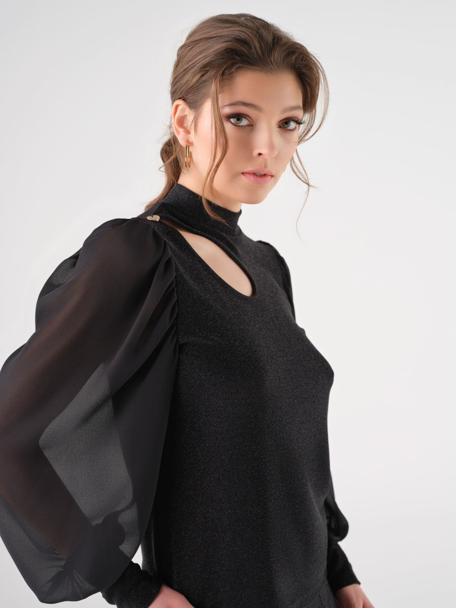 Atrage toate privirile cu aceasta bluza neagra eleganta, care imbina perfect un material subtil stralucitor cu manecile voluminoase din voal