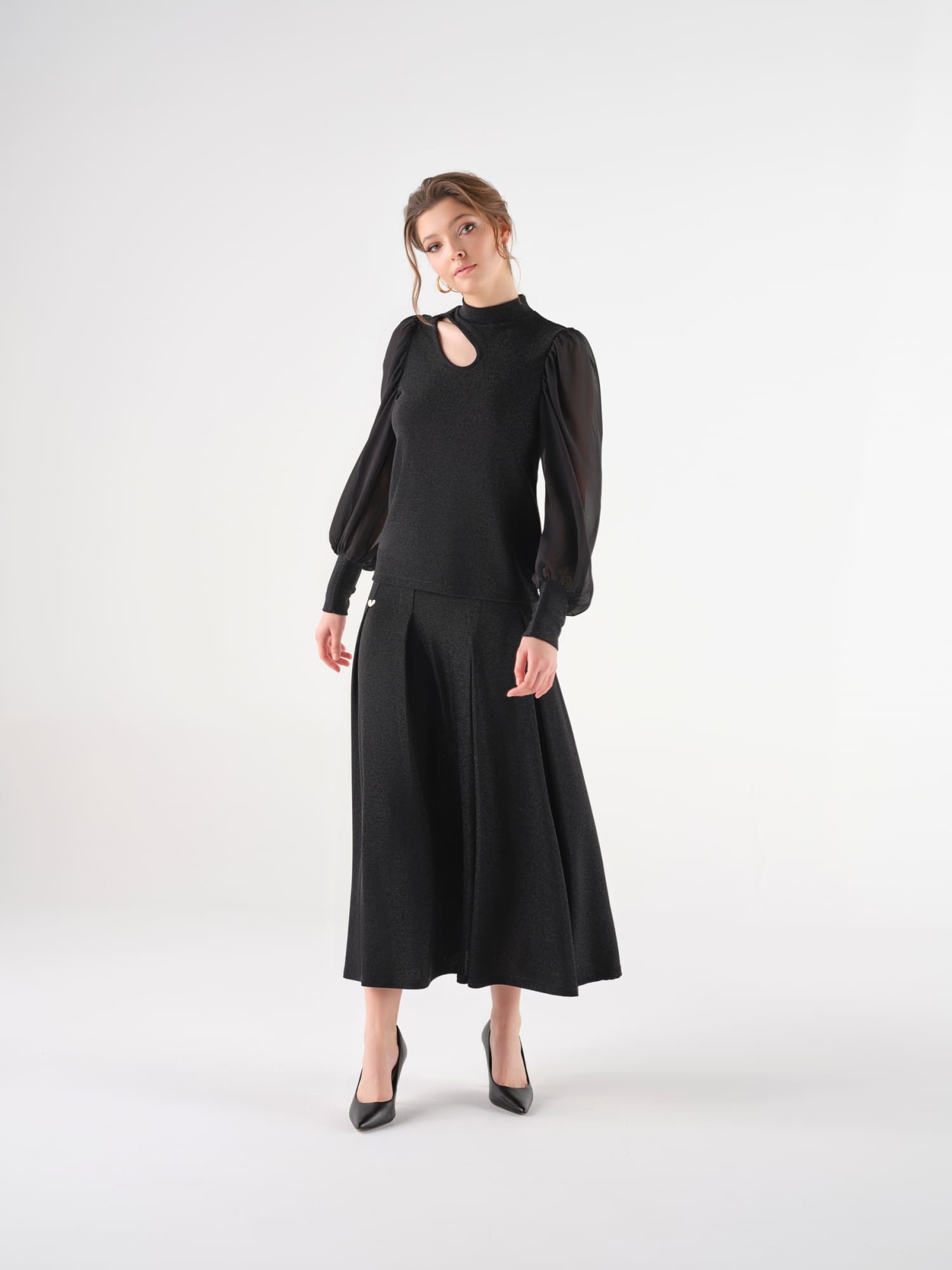 Atrage toate privirile cu aceasta bluza neagra eleganta, care imbina perfect un material subtil stralucitor cu manecile voluminoase din voal transparent. Decupajul asimetric de la baza gatului si gulerul usor inalt ii confera un aer rafinat si misterios, fiind piesa ideala pentru o tinuta de seara impecabila.