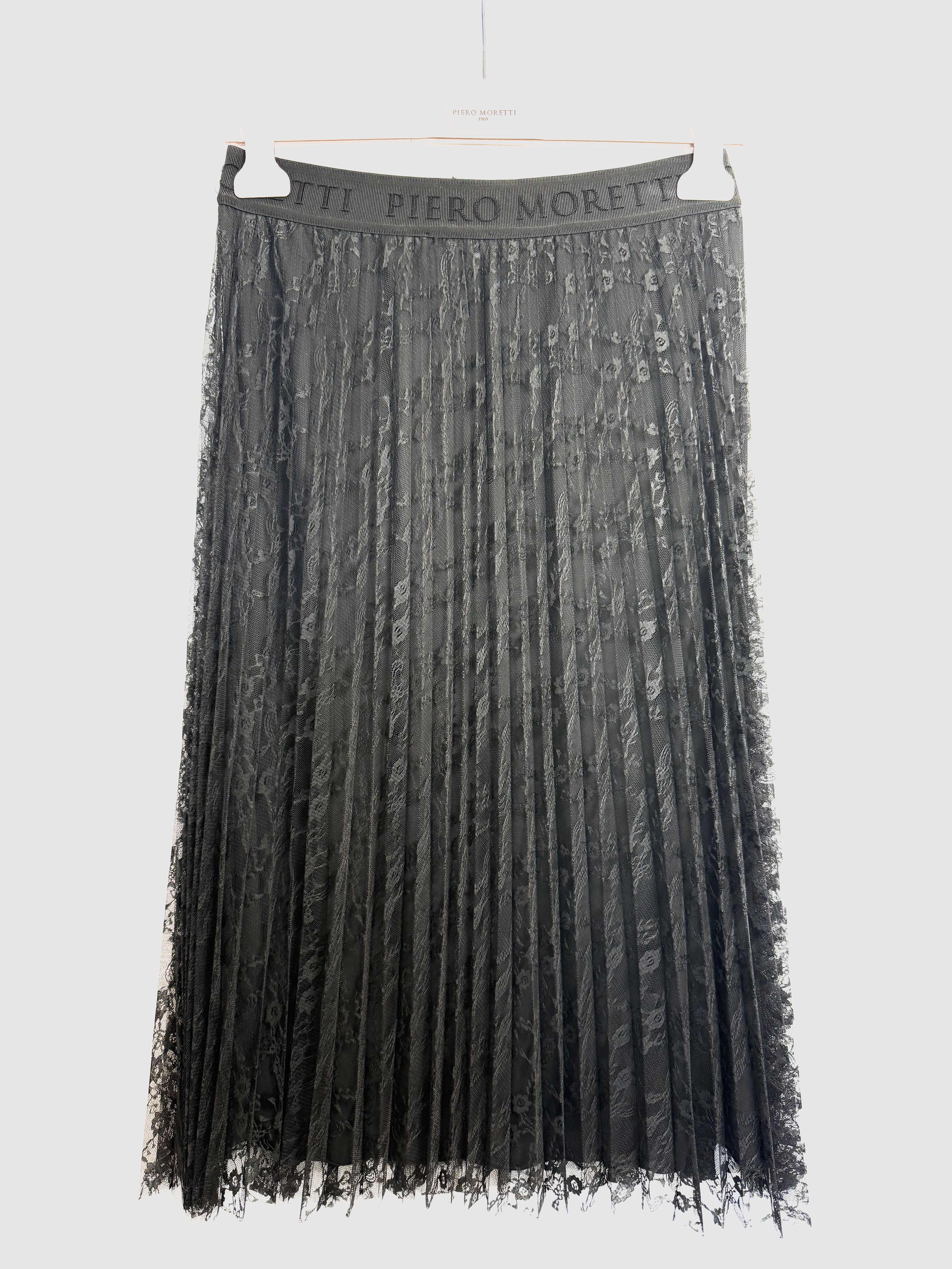 Aceasta fusta midi plisata, semnata Piero Moretti, impresioneaza prin eleganta dantelei negre fine si croiala fluida care ofera o nota sofisticata oricarei tinute.Designul este completat de o banda elastica lata in talie, personalizata cu logoul brandului, asigurand un confort sporit si o potrivire impecabila.Ideala pentru evenimente speciale sau o iesire in oras, piesa imbina texturile moderne cu un stil clasic, fiind usor de asortat atat cu pantofi eleganti, cat si cu botine.