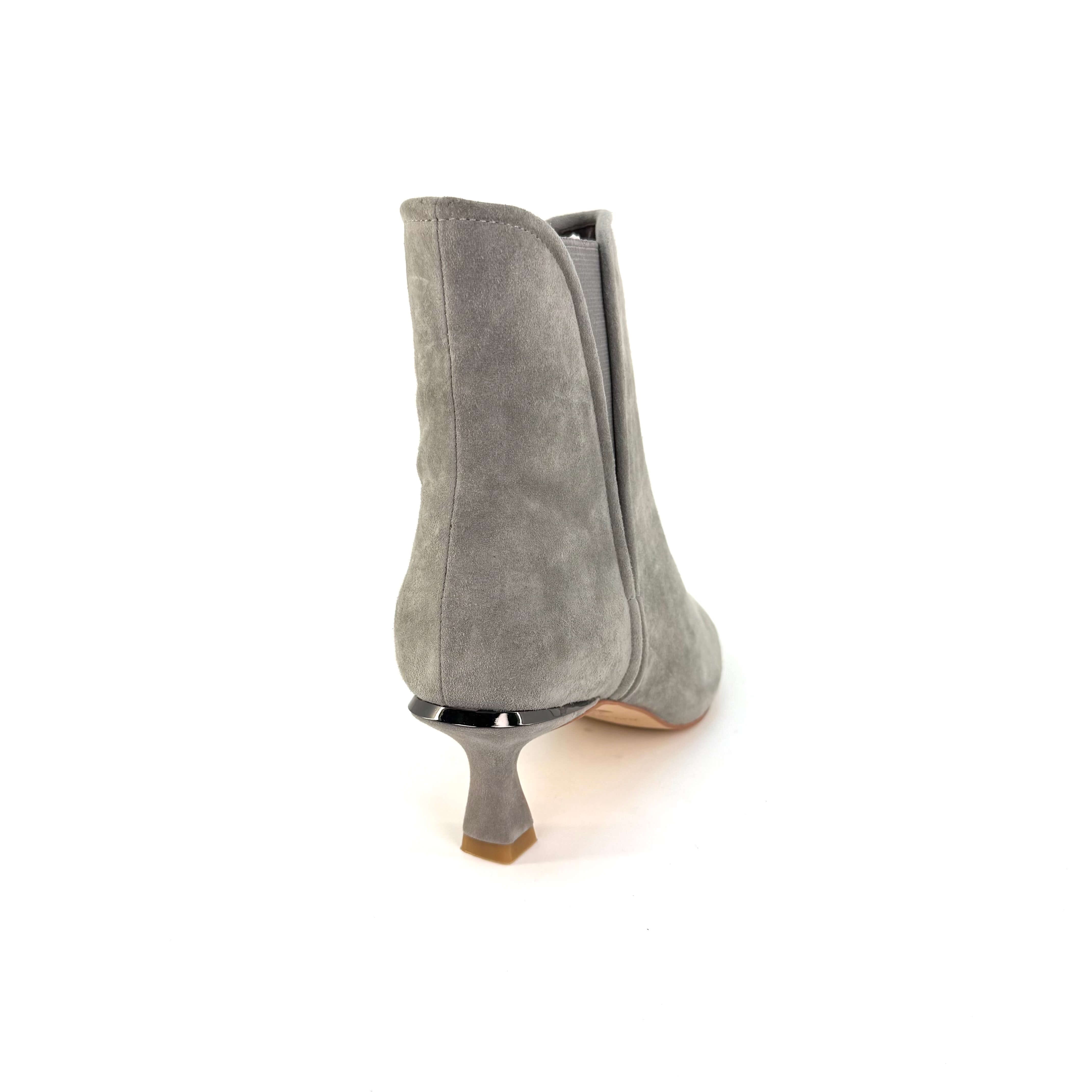 O botină elegantă din piele întoarsă gri, cu vârf ascuțit și toc mic, sculptat.