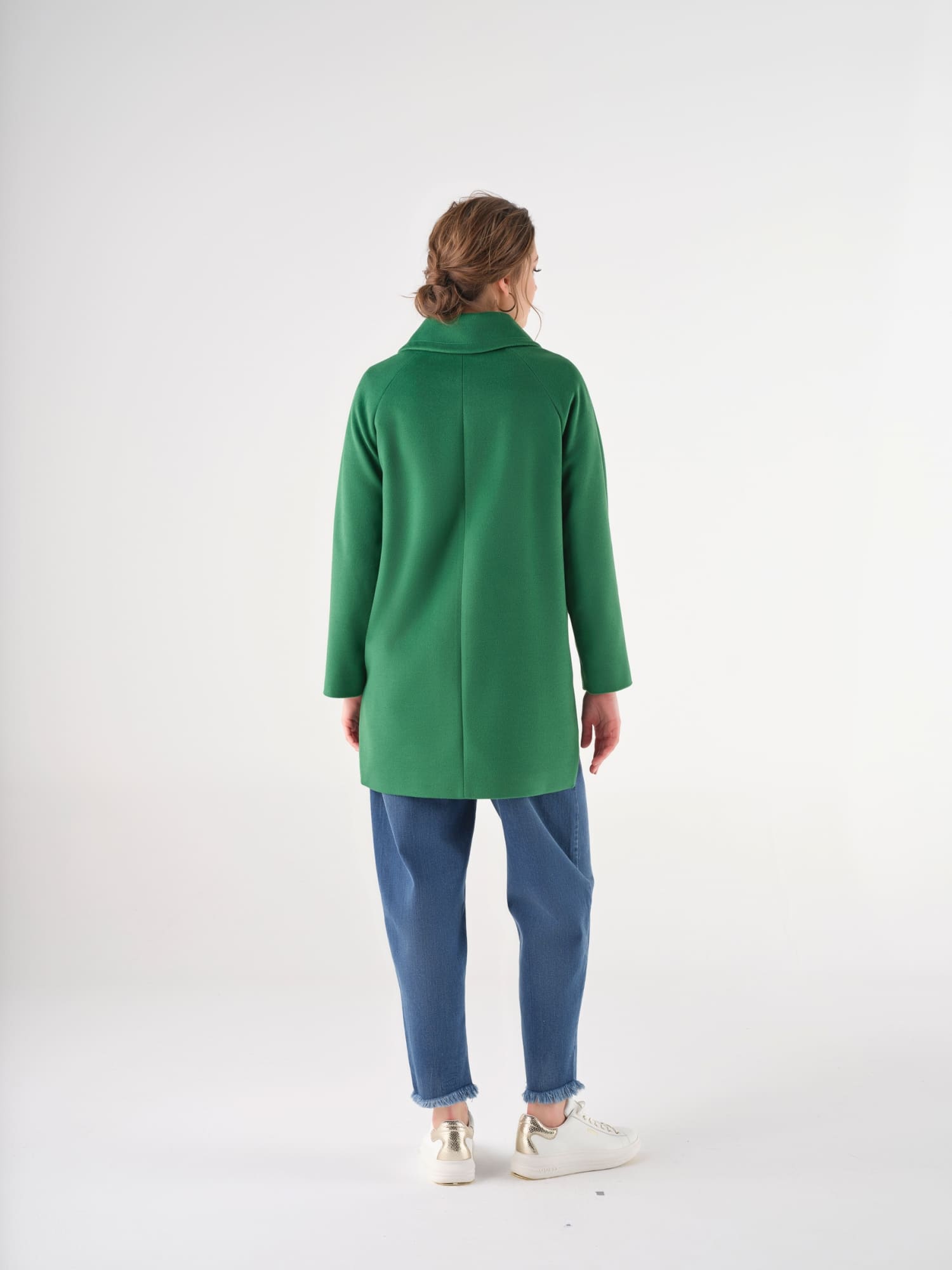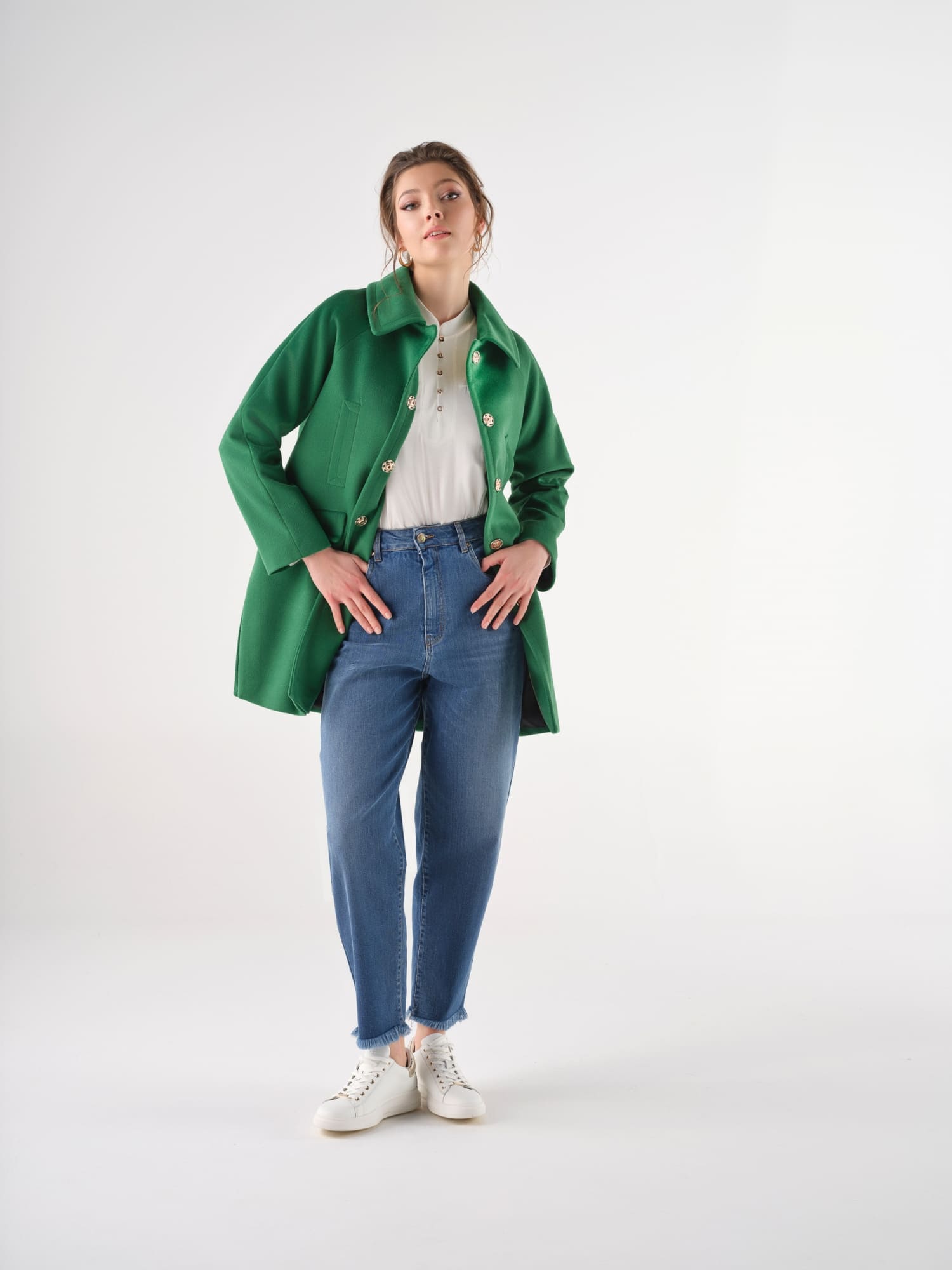Iesi in evidenta in sezonul rece cu acest palton verde smarald, remarcabil prin textura deosebita si croiala impecabila. Gulerul clasic, buzunarele frontale practice si detaliul metalic discret il transforma intr-o piesa de rezistenta ce imbina functionalitatea cu un aer sofisticat.
